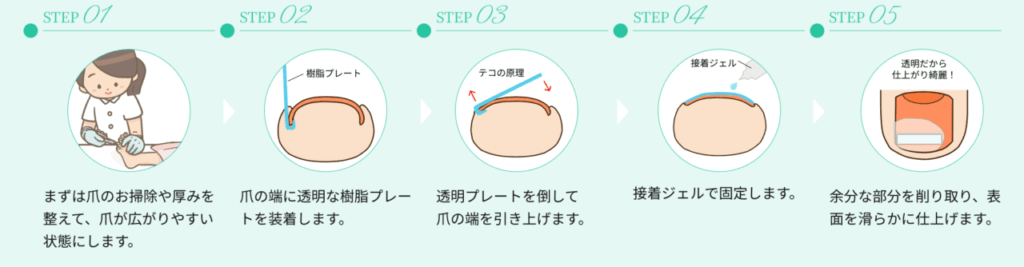 アルコール→お爪の表面を整えと爪下の掃除→器具の装着→矯正→器具の整え