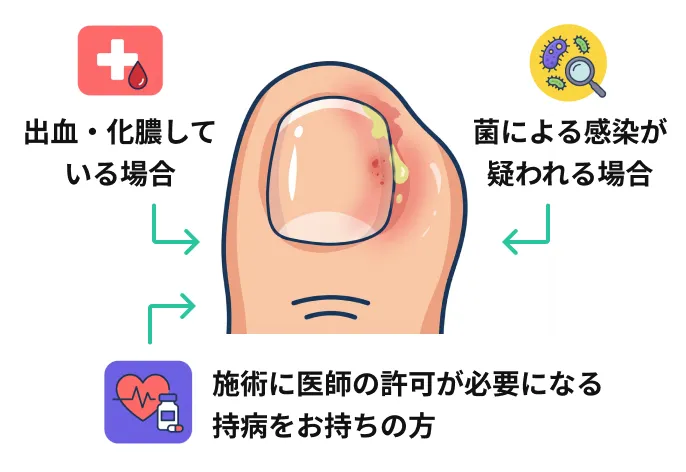 病院での治療により出血や化膿が落ち着いたあとも、爪の根元が巻いたままだと、爪が伸びた際に再び刺さってしまうことがあります。