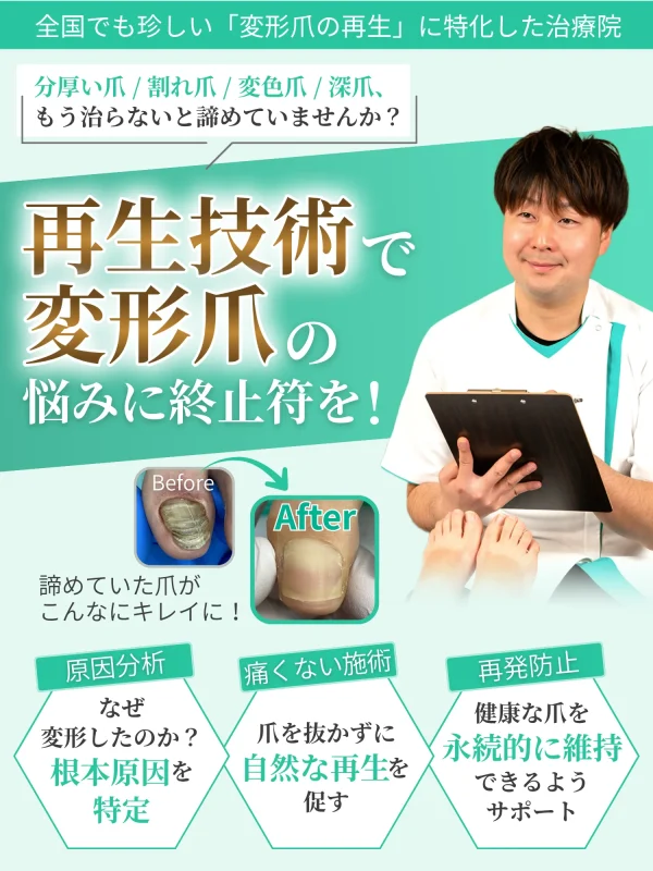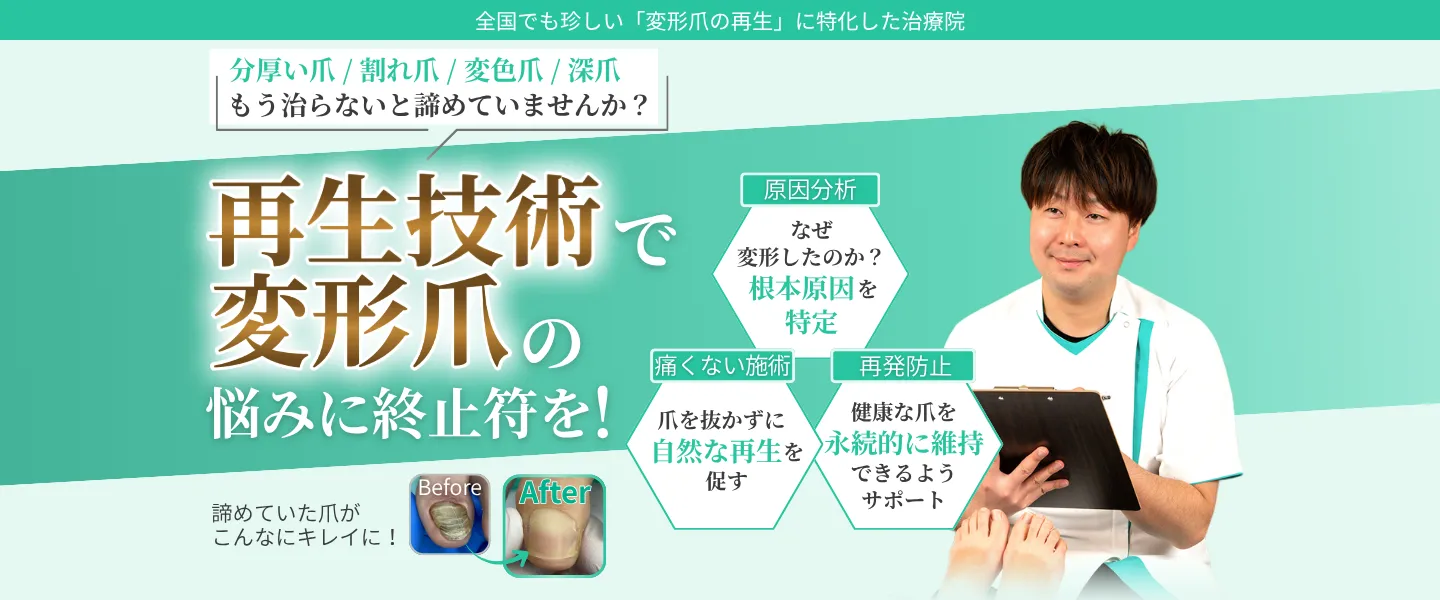 爪の厚みは、外的な圧迫や代謝の低下などが原因で変形していることが多く、当院では専用のケアで元の厚みに近づけることが可能です。症状に応じて最適な施術をご提案しますので、まずはご相談ください。